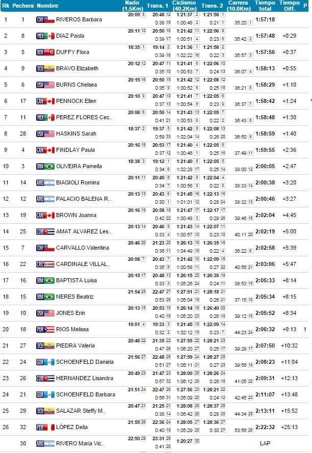 La tica finalizó la exigente prueba en el puesto 16, con un tiempo de 2:06:03, a 5:47 de la chilena Bárbara Riveros, quien se colgó la medalla de oro, al parar el reloj en 1:57:18.