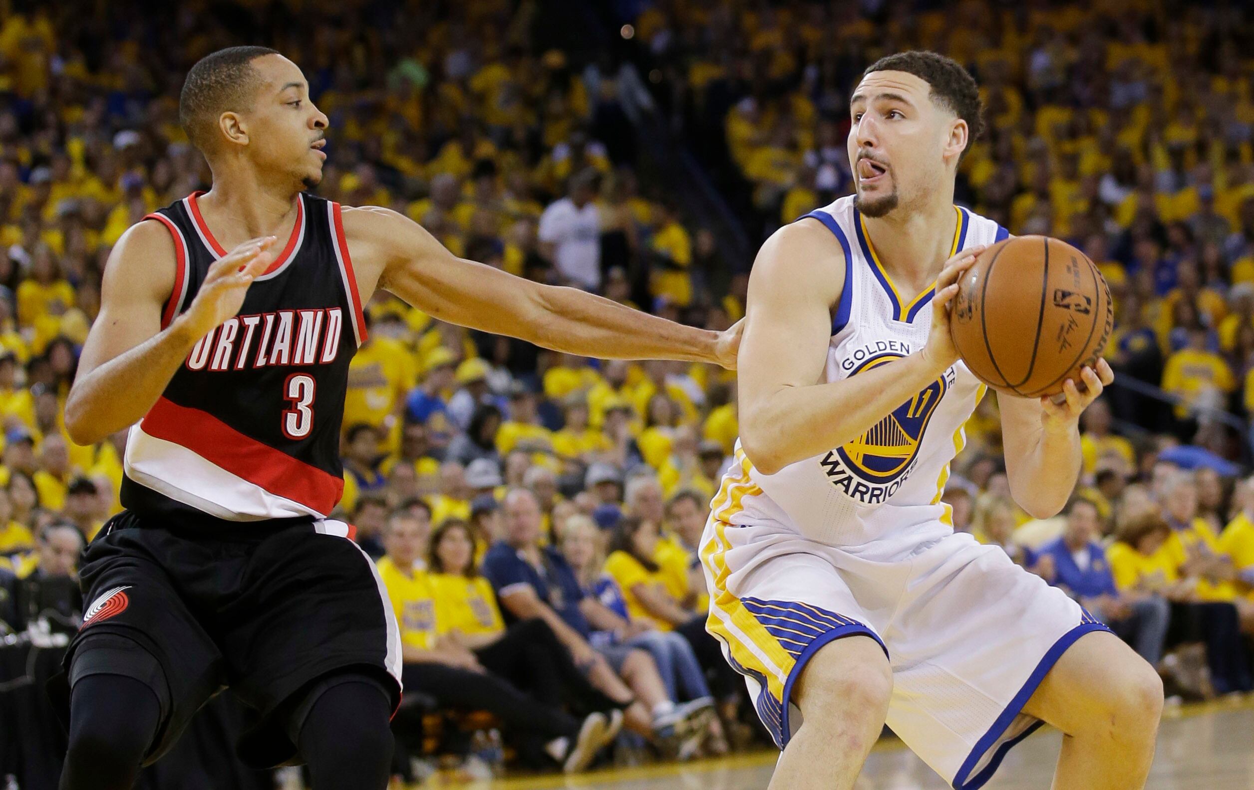 Klay Thompson anotó 37 puntos, en otra actuación brillante, y los Warriors de Golden State volvieron a lucir arrolladores pese a jugar sin su astro Stephen Curry, para vapulear el domingo 118-106 a los Trail Blazers de Portland, en el primer encuentro de la semifinal de la Conferencia del Oeste.