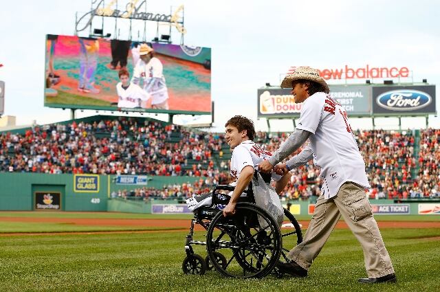 El tico recorrió la cancha junto a Jeff Bauman, joven al que rescató durante el atentado en el Maratón de Boston.