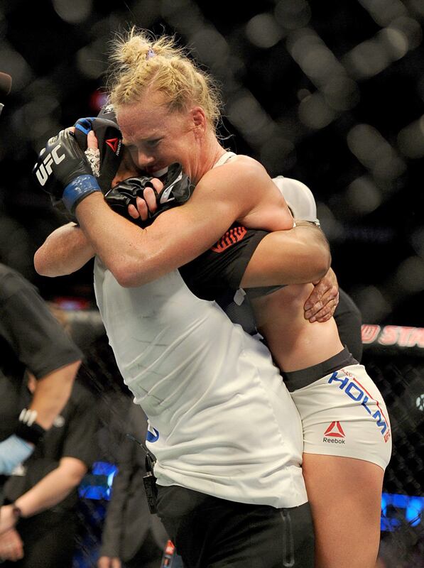 La estratega Holm. Días antes de la pelea, Rousey anticipó en el programa de entrevistas The Tonight Show Starring Jimmy Fallon que se enfrentaría con una de sus principales amenazas y que probablemente esta no acabaría tan rápido como sus anteriores luchas.