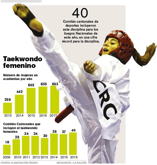 Los datos empiezan a convertirse en tendencia, pues en menos de cinco años el taekwondo triplicó el número de mujeres que practican este arte marcial en las academias del país: se pasó de tener 258 atletas a 653 en cuatro años, según el registro de los centros inscritos por la Federación Costarricense de Taekwondo.