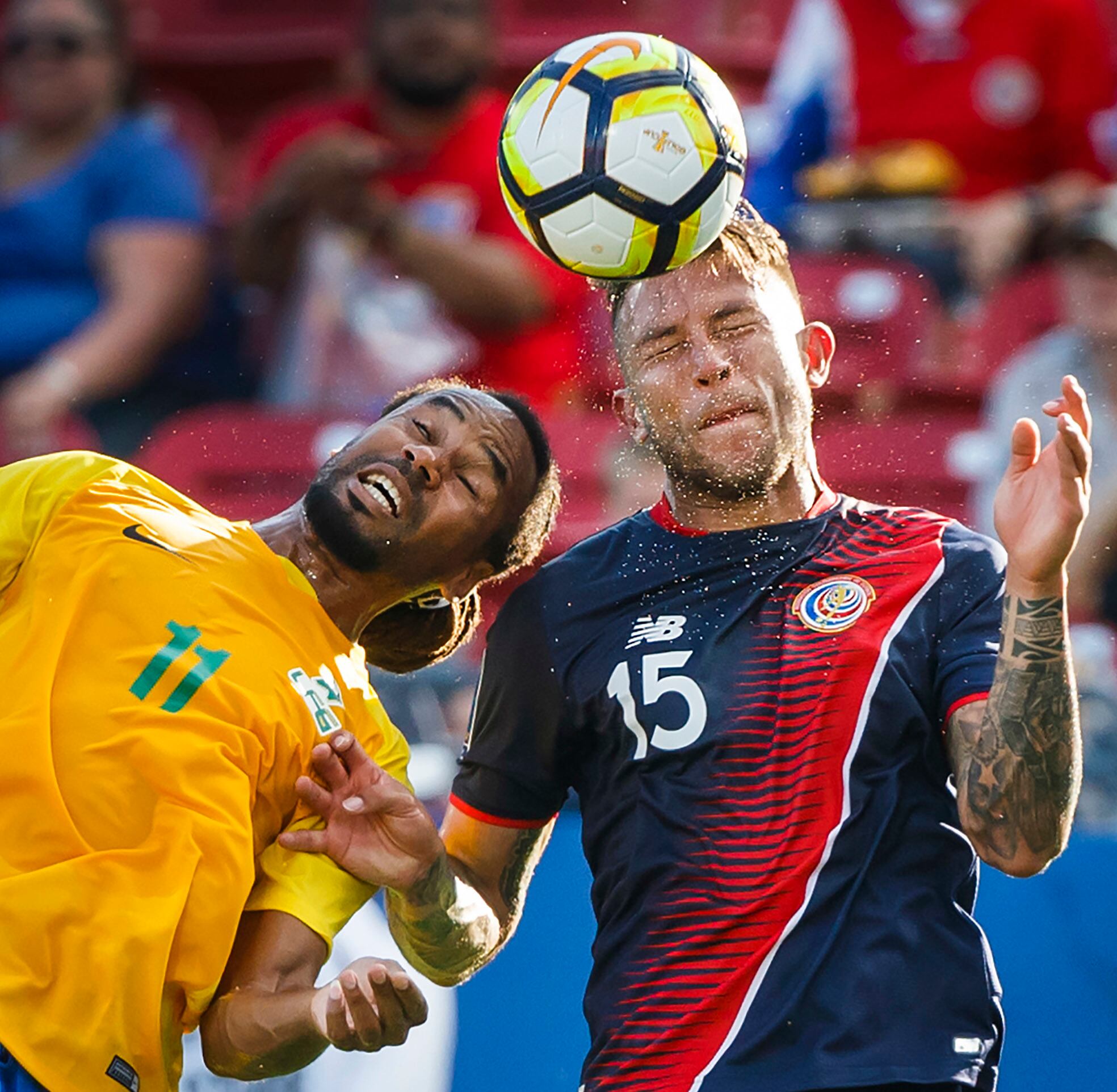 Francisco Calvo pelea un balón en las alturas con el futbolista de Guayana Roy Contout. (Agencia AP)