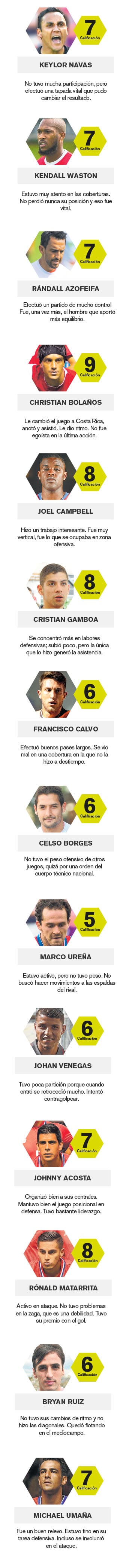 Alineación de la Nacional: Keylor Navas; Johnny Acosta, Kendall Waston, Francisco Calvo (Michael Umaña 41'), Christian Gamboa y Rónald Matarrita; Celso Borges, Christian Bolaños, Rándall Azofeifa y Bryan Ruiz (Johan Venegas 76'); Marco Ureña (57').