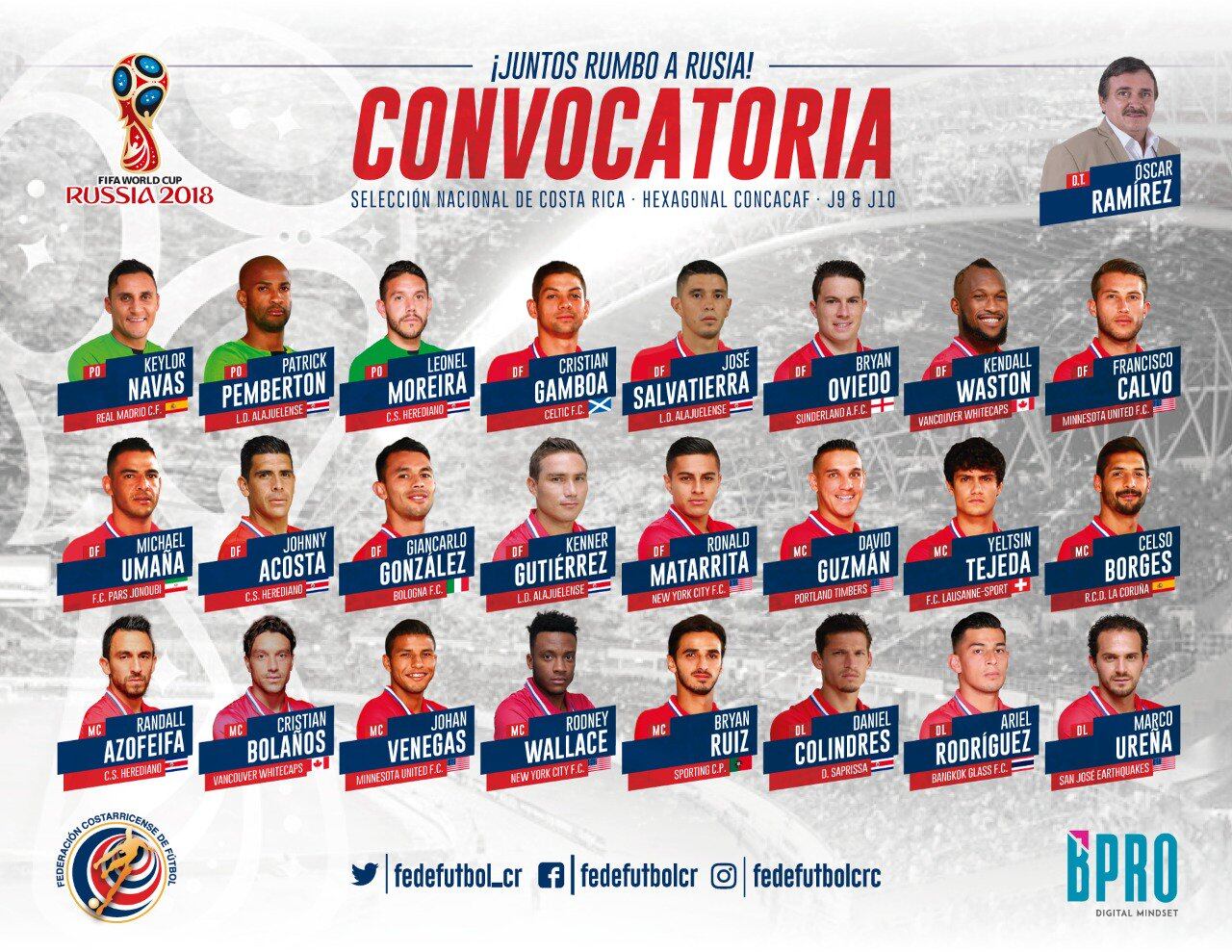 Defensas: Cristian Gamboa (Celtic), José Salvatierra (Alajuelense), Bryan Oviedo (Sunderland), Kendall Waston (Vancouver Whitecaps), Francisco Calvo (Minnesota United), Michael Umaña (Pars Jonoubi), Johnny Acosta (Herediano), Giancarlo González (Bolonia), Kenner Gutiérrez (Alajuelense) y Rónald Matarrita (New York City).