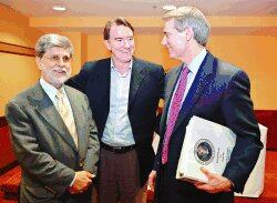 Celso Amorim, Peter Mandelson, y Robert Portman (izquierda a derecha) limaron asperezas durante su encuentro en Río de Janeiro, Brasil. | AP (MARCELO SAYAO)