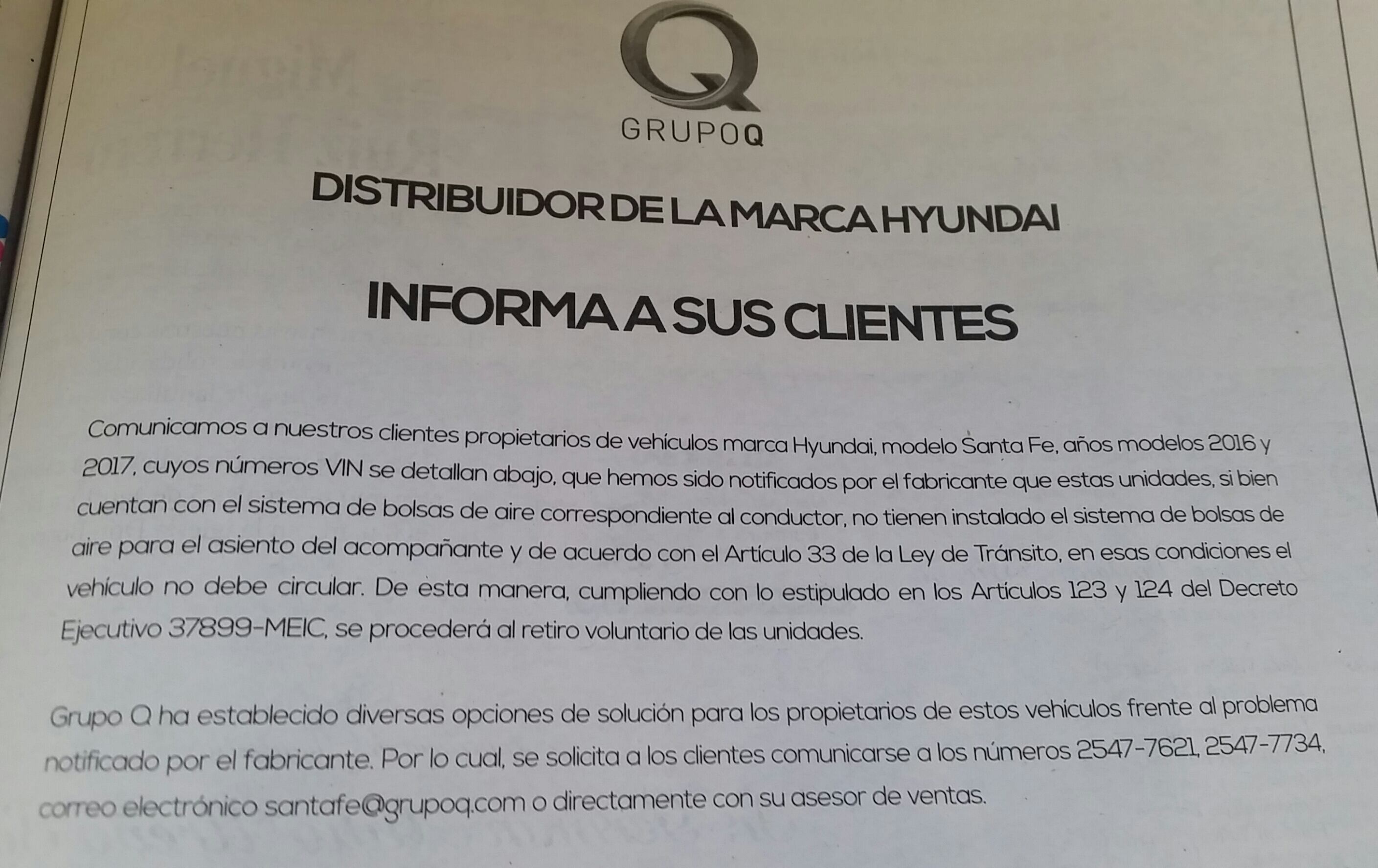 Vehículos modelo Santa Fe, años 2016 y 2017, carecen del dispositivo de seguridad frente al asiento del acompañante