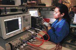 Katherine Cruz prueba uno de los amplificadores para telefonía celular que la compañía Siemens le encargó a Remecinc. La empresa ha invertido más de $20 millones en su planta donde laboran 200 personas. | JORGE ARCE PARA LN