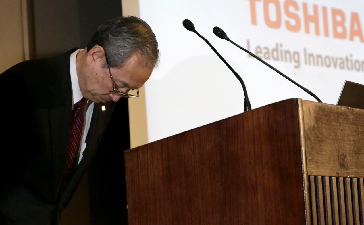 Presidente de Toshiba Satoshi Tsunakawa en conferencia de prensa. (AP)
