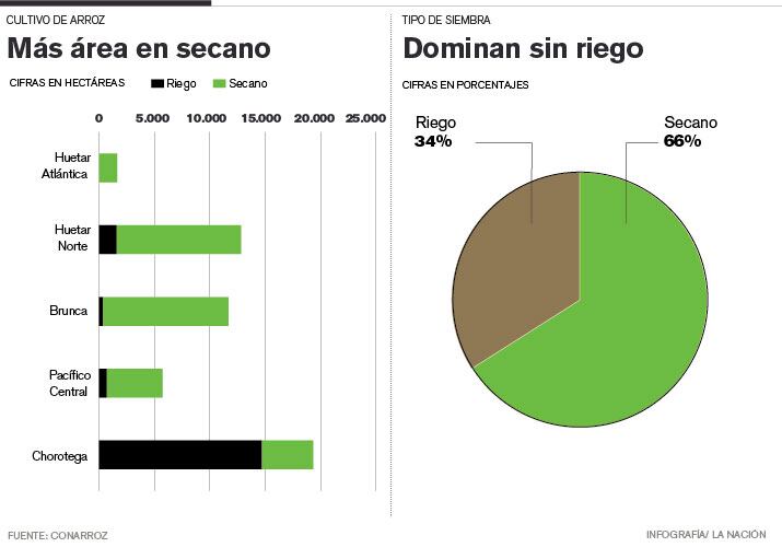 Un 66% del arroz que se cultivó en Costa Rica en el periodo 2013-2014 se sembró en áreas donde no hay irrigación; es decir, en secano. Se trata de 43.640 hectáreas de las 66.135 hectáreas cultivadas en ese periodo productivo.