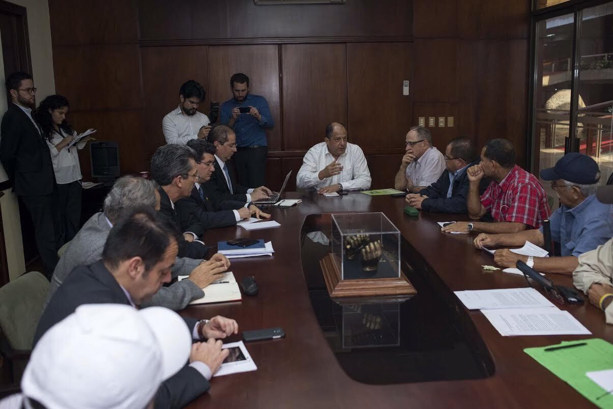 Un grupo de ocho dirigentes de grupos agrícolas que protestaron en horas de la mañana frente a Casa Presidencial ingresó a las 10:40 a. m. de este martes 23 de junio a la cita con el presidente de la República, Luis Guillermo Solís y varios de sus ministros. La cita concluyó al ser las 3:20 p. m.