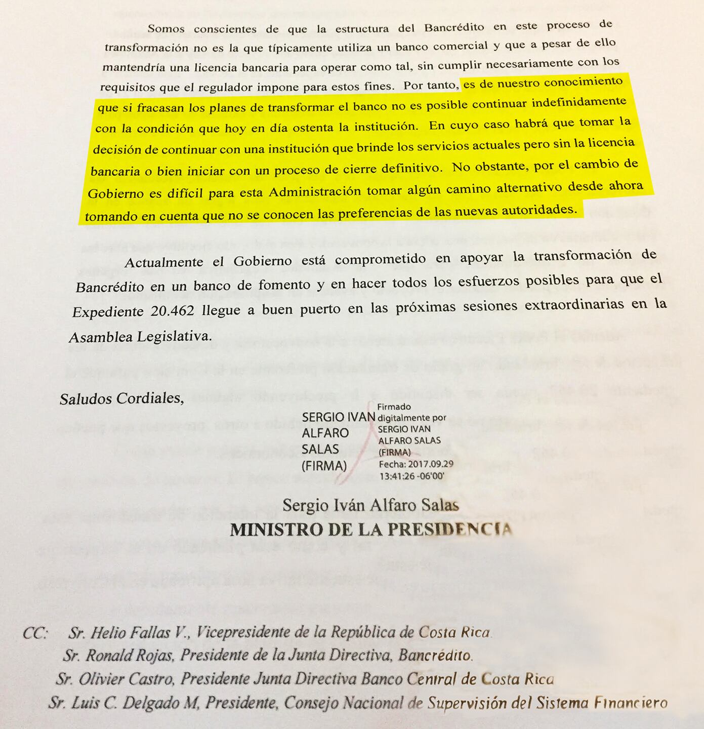 El oficio del jerarca de la Presidencia resume la reunión, del pasado 26 de setiembre, en Casa Presidencial en la cual participaron el mandatario Luis Guillermo Solís; Helio Fallas, jerarca de Hacienda; Olivier Castro, presidente del Banco Central; la Junta Directiva del Banco; y Gerardo Porras, gerente de Bancrédito.