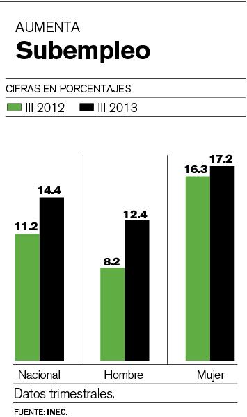 Así lo indica la Encuesta Continua de Empleo, del Instituto Nacional de Estadística y Censos (INEC), publicada ayer, según la cual el subempleo fue del 14,2% al tercer trimestre de este año, frente al 11,2% del mismo periodo del 2012.