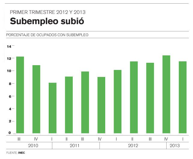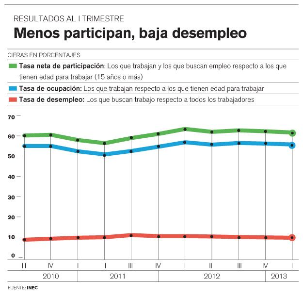 Así lo reflejan los resultados de la Encuesta Continua de Empleo que publicó ayer el Instituto Nacional de Estadística y Censos (INEC), según la cual la tasa de desempleo pasó de 10,4% en el primer trimestre del 2012 a 9,6% en el primer trimestre del 2013.