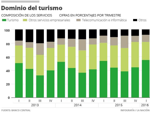 Así lo reflejan los datos solicitados al Banco Central, según los cuales el turismo representó entre el 32% y el 55% de los ingresos por servicios, según un desglose por trimestres desde el primero del 2012 hasta el primero de este 2016.