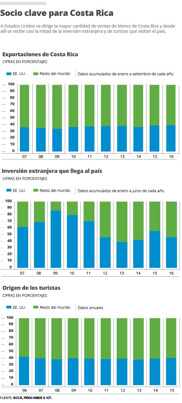 “Trump habló en su campaña de cerrar la economía, ya sea al comercio internacional o a las migraciones. Eso sin duda no sería bueno para Costa Rica, ya que en los últimos 30 años el país ha surgido en buena parte por las exportaciones, y en especial a ese mercado”, dijo Franco Pacheco, presidente de la Unión Costarricense de Cámaras y Asociaciones del Sector Empresarial Privado.