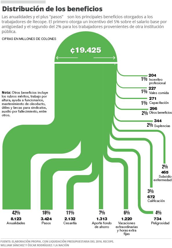 Entre los sobresueldos está el nuevo plus para los 1.340 empleados no profesionales de entre 3% y 5% sobre el salario base del trabajador. Este beneficio, incorporado el año pasado, ascendió a ¢204 millones.