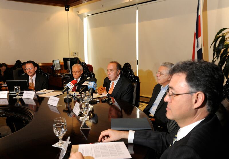 Lorenzo Figliuoli (al centro), jefe de la misión del FMI, explicó las recomendaciones. A su derecha, el ministro de Hacienda, Helio Fallas y el gerente del Banco Central, Eduardo Prado. A su izquierda, el presidente del Banco Central, Olivier Castro y Mario Garza, del FMI. | EYLEEN VARGAS (Credit Eyleen Vargas)