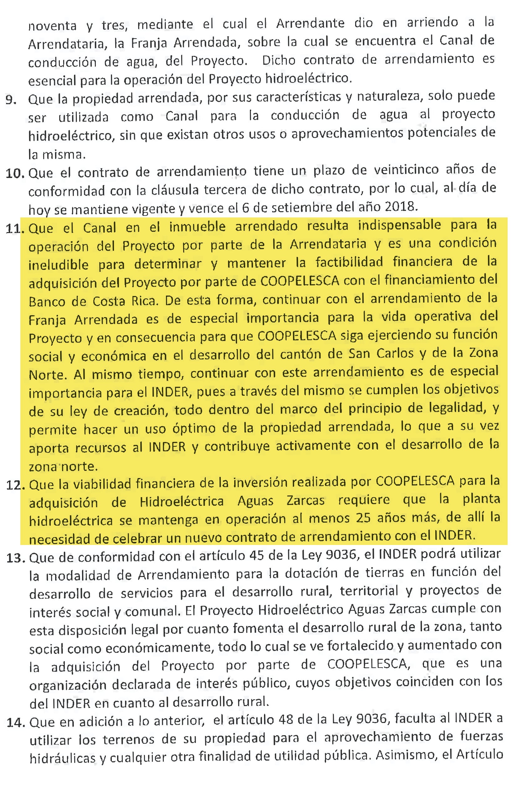 "En lo que se refiere a prorrogar el arriendo eso sería negativo, totalmente, porque el artículo tercero del contrato entre el antiguo IDA e Hidroeléctrica Aguas Zarcas establece que el plazo de arrendamiento es por 25 años no prorrogables (...) periodo que se cumple el 6 de setiembre del 2018", explicó Diana Murillo, gerenta del Inder.