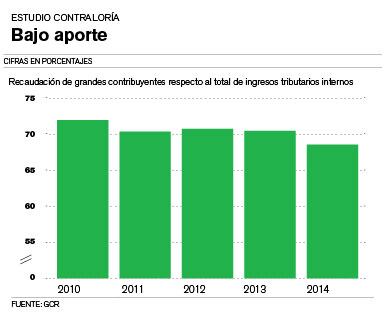 En el periodo de estudio, bajó el monto de tributos aportado por grandes contribuyentes respecto al total de recaudación interna del Gobierno.