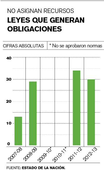 Dicha normativa es un ejemplo entre un total de 63 leyes, aprobadas entre el 2011 y 2013, que crean nuevas funciones y gasto público, pero no establecen mecanismos de financiamiento.