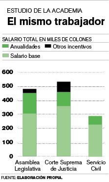 En el caso de las posiciones más bajas con salarios iguales a otras más altas, el estudio de la Academia menciona el caso de un jefe de unidad, en el 2013, cuya remuneración base es 32% mayor que el de un asistente técnico. Sin embargo, un asistente técnico con 11 anualidades ganaría el mismo salario total que un jefe de unidad con dos anualidades: ¢1 millón.