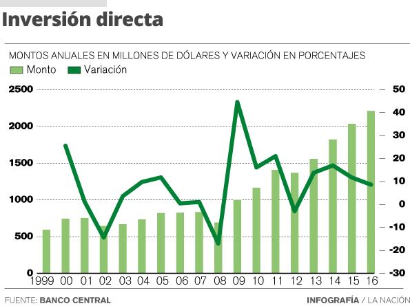 La inversión directa de extranjeros en Costa Rica alcanzó, en el 2016, un total de $2.211 millones, 9% más que en el 2015, crecimiento poco menor al de los dos años previos.