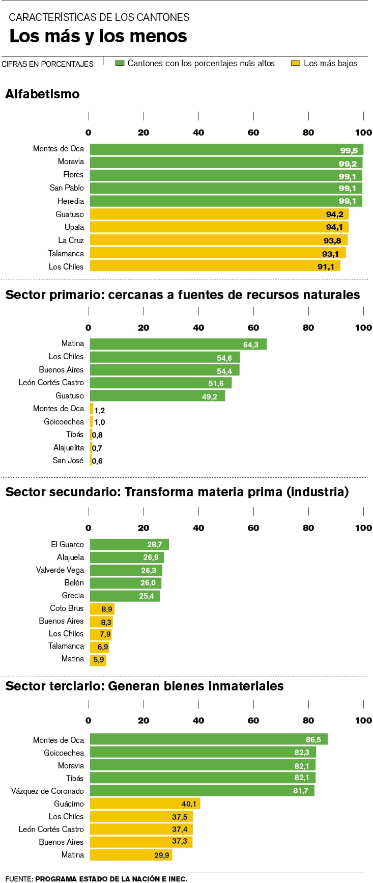 Los cantones que tienen una mayor parte de su población ocupada en el sector terciario generalmente tienen mejores indicadores como alfabetismo, acceso a servicios y casas en buen estado, mientras que los que tienen una mayor parte de su población que laboran en el sector primario (agro), como Matina y Los Chiles, tienen indicadores más malos en esas áreas.