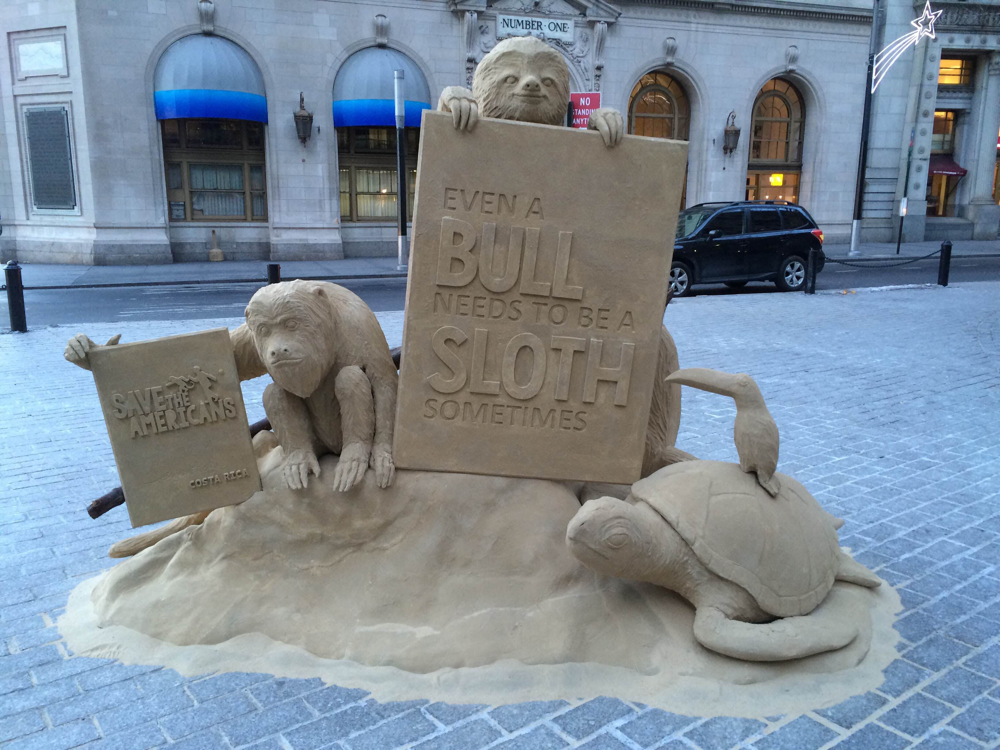 Durante todo este jueves una escultura de arena con animales representativos de Costa Rica se mantendrá expuesta en Wall Street de Nueva York, Estados Unidos, con el fin de llamar la atención de las miles de personas que transitan esa calle y al mismo tiempo invitarlos a que visiten Costa Rica.