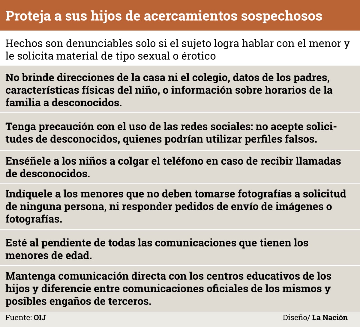 El Organismo de Investigación Judicial (OIJ) informó de que ha recibido reportes de hombres que llaman a casas y piden información sobre niños y jóvenes y, al no conseguir hablarles directamente, solicitan información sobre ellos. No obstante, la entidad se declara incapaz para actuar a menos que se consume un delito.