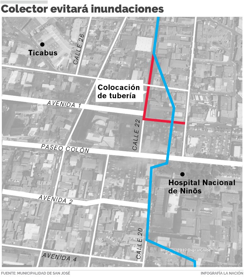 A partir de este miércoles el paso por un tramo de la calle 22 y la avenida 1, cerca del Paseo Colón estará cerrado, debido a que en ese lugar la Municipalidad de San José colocará una tubería paralela al sistema pluvial existente con el fin de evitar inundaciones en el Hospital Nacional de Niños.