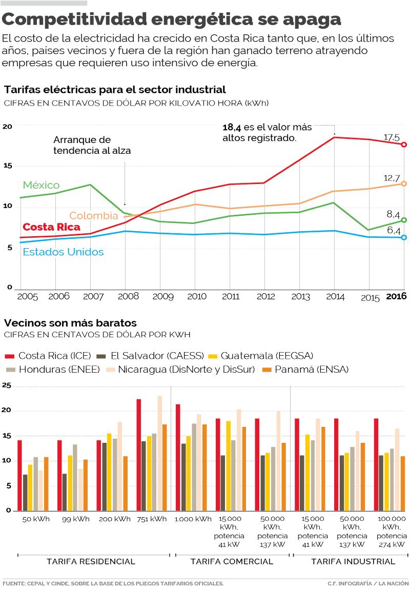 En el 2016, según Cepal, el costo promedio en Centroamérica de un kilovatio hora (kWh) fue de 13,48 centavos de dólar mientras en Costa Rica fue 18,47 centavos de dólar; 37% más para consumos industriales de 100.000 kWh. En El Salvador y Guatemala, dicho costo fue de 11,03 y 11,54 respectivamente. En Panamá, 10,92 centavos de dólar.