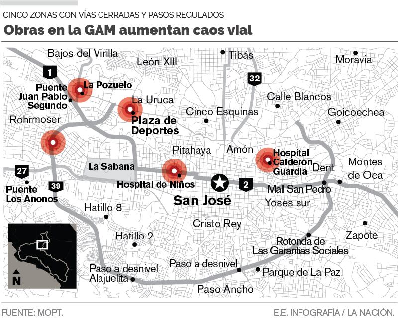 Cerca del Paseo Colón hay un trayecto de alrededor de 100 metros con cierre total, producto de las obras para evitar inundaciones en el Hospital Nacional de Niños. El cierre se ubica cerca de la escuela Juan Rafael Mora, sobre la calle 22.