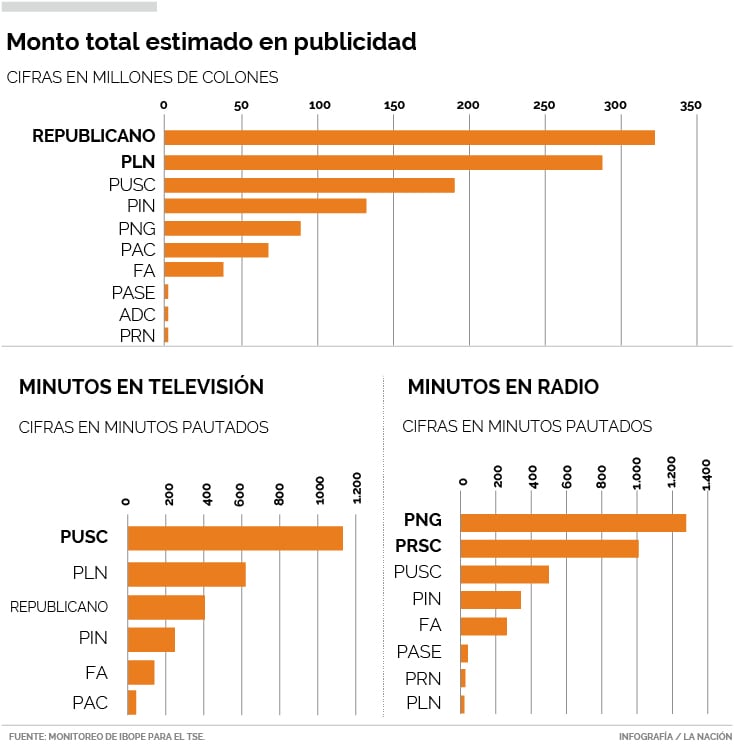 Las agrupaciones que menos han invertido en publicidad en los medios son Accesibilidad Sin Exclusión (PASE), con ¢2,1 millones; Alianza Demócrata Cristiana (ADC), con ¢1.000.000; y Restauración Nacional, con ¢759.000.
