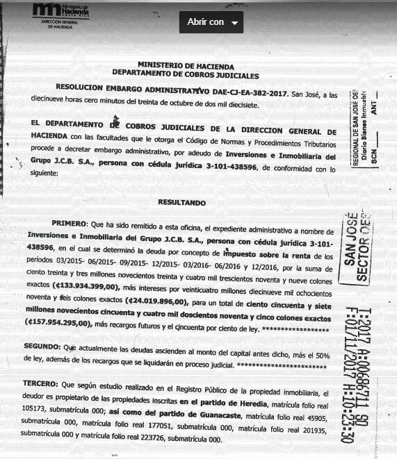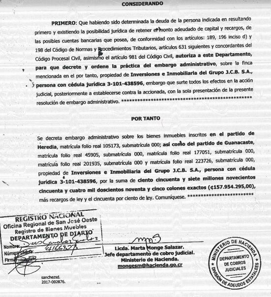 Según los documentos de embargo, Hacienda tomó la acción reclamando el pago de ¢170 millones, monto que incluye ¢29 millones por intereses.