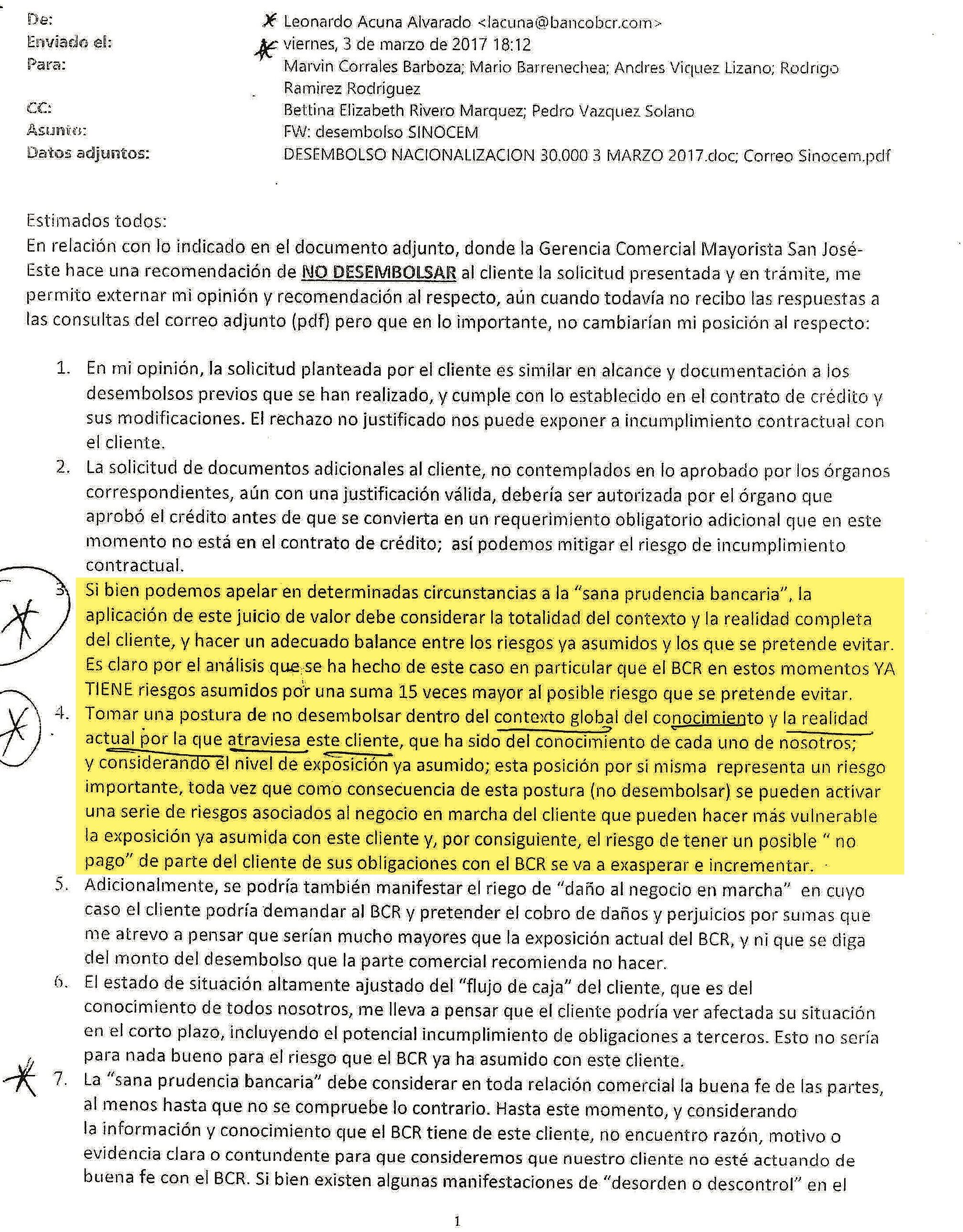 Ellas, desde abril del 2016, recomendaron que se detuvieran los giros de dinero a Bolaños. No obstante, sus superiores ignoraron al menos cinco sugerencias en ese sentido y, al cierre del 2016, el BCR le había girado casi $39 millones a Sinocem aunque la compañía solo importó $9,7 millones en cemento.