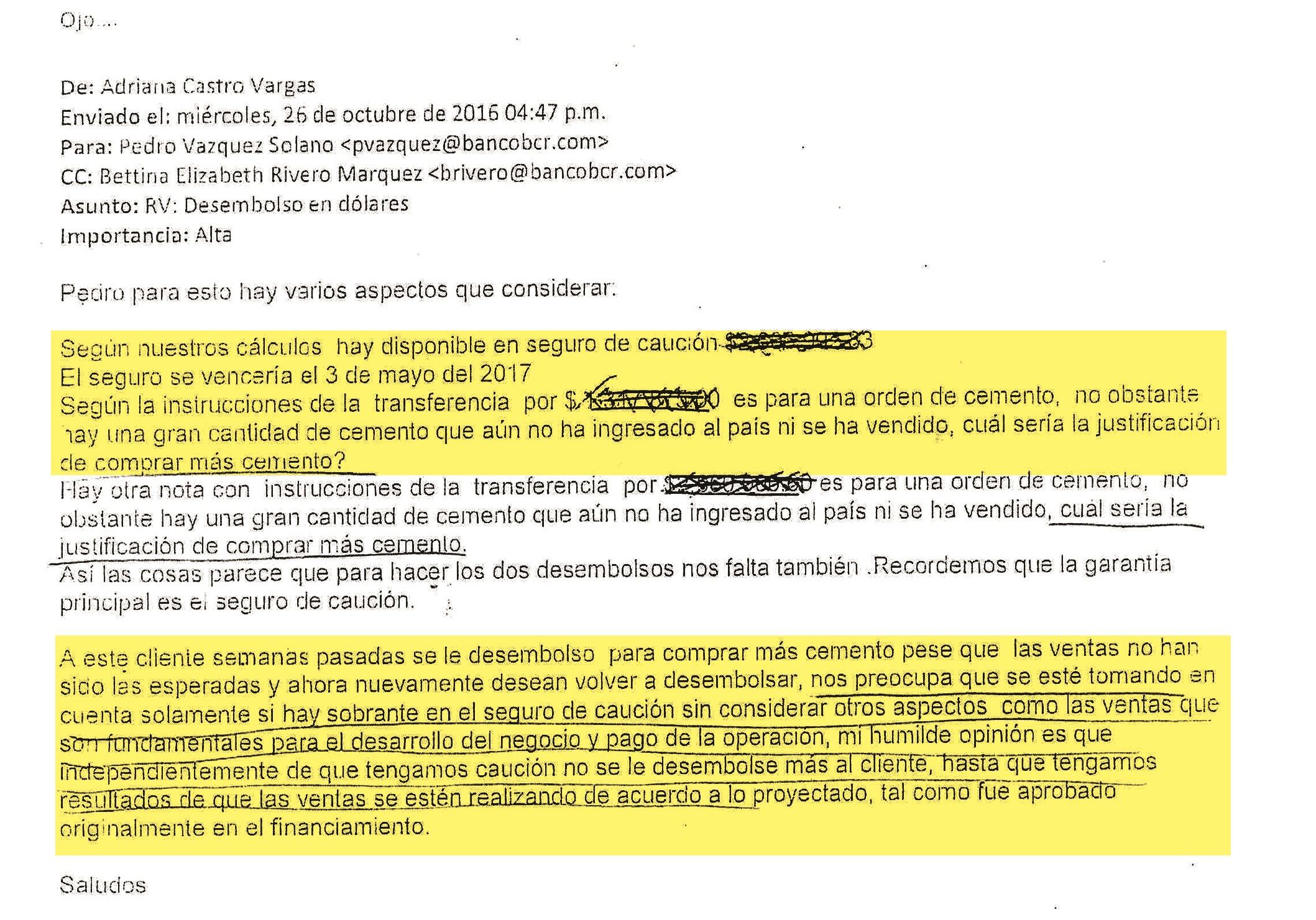El 16 de noviembre del 2016, la ejecutiva adjunta corporativa, Bettina Rivero, también remitió un advertencia al gerente Vásquez. En el correo electrónico, afirma que Adriana Castro y ella no están "de acuerdo con que se sigan realizando desembolsos para la importación de cemento a este cliente".