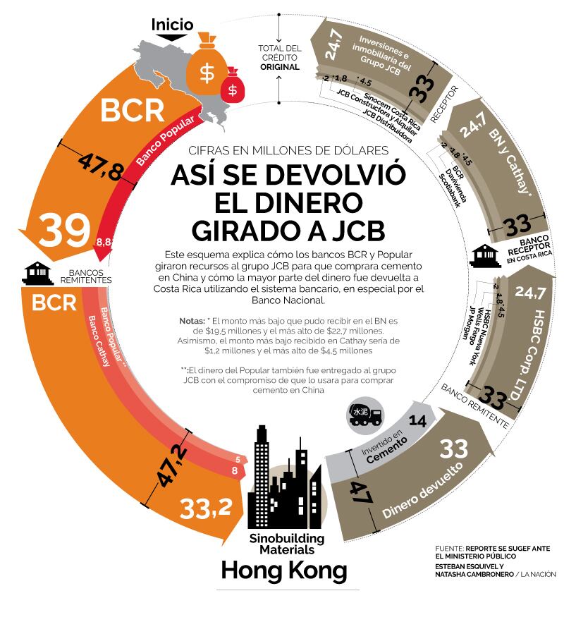 Entre ambos bancos, el grupo empresarial JCB recibió $47,8 millones entre el 2015 y el 2017. En el caso del BCR, los recursos se giraban de forma directa al proveedor Sinobuilding Materials Hong Kong. No obstante, en cemento solo se invirtieron unos $14 millones. ¿Qué ruta tomó el resto del dinero?
