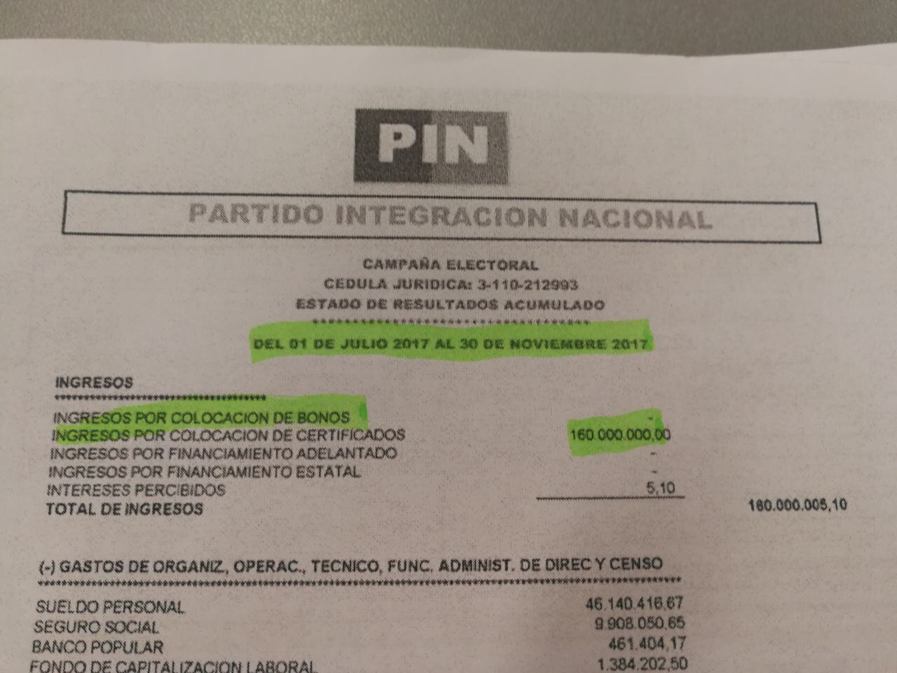 En el reporte financiero con corte a noviembre, Integración Nacional registra ingresos por los ¢160 millones de los bonos. En ese mes, el partido dice haber recibido donaciones por ¢2,48 millones.