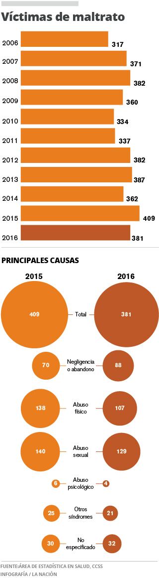 En total, desde ese año y hasta el 2016, los hospitales de la CCSS tuvieron que atender a 6.583 víctimas de maltrato. No trascendió la cifra de mortalidad por esa causa.