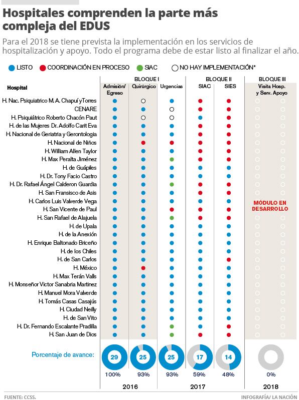 En el primero, la Caja Costarricense de Seguro Social (CCSS) prácticamente lo considera completo porque el EDUS opera en los 1.042 Equipos Básicos de Atención en Salud (Ebáis) del país, pese a que como en La Unión aún faltan por incluir los exámenes de laboratorio y farmacia, pero en los hospitales todavía es un gran desafío para el cual tienen poco más de un año.