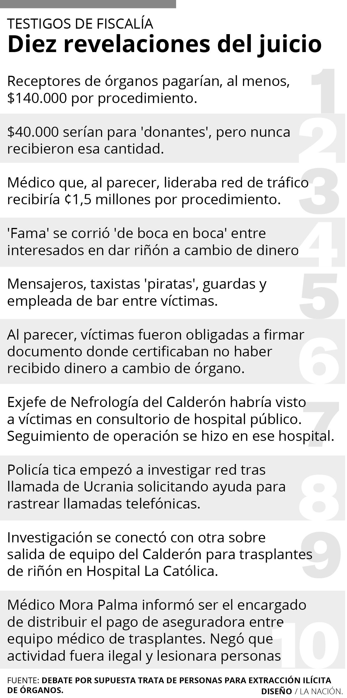 En el proceso hay cinco imputados. Uno de ellos, el exjefe de Nefrología Francisco Mora Palma, a quien la acusación del Ministerio Público le atribuye ser el líder de una red para la extracción ilícita de riñones, órganos que, al parecer, fueron trasplantados a enfermos extranjeros después de pagar, al menos, $140.000.