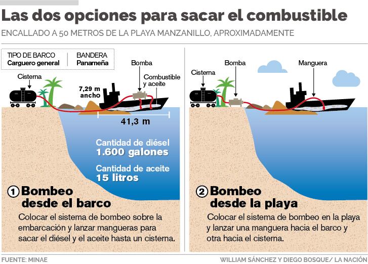 Sacar los 6.000 litros (1.600 galones) de diésel y 15 litros de aceite hidráulico que contiene el buque de bandera panameña encallado a pocos metros de distancia de la playa Manzanillo, en Cahuita, Limón, tomará cerca de 18 horas. Esa playa está dentro del refugio de vida silvestre Gandoca-Manzanillo, en el Caribe.