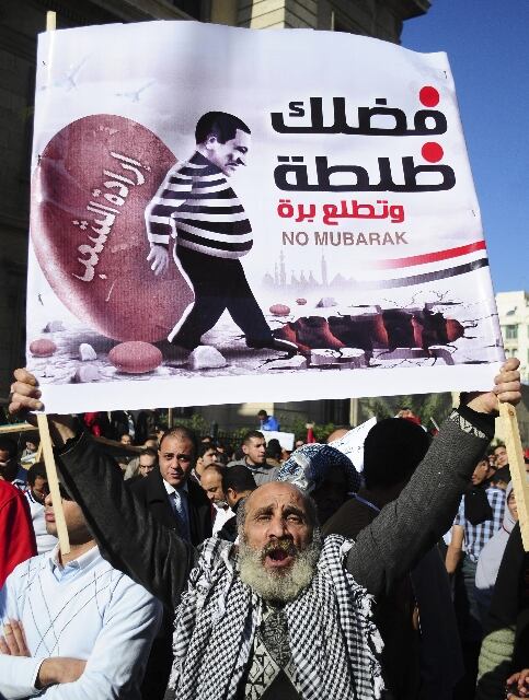En la plaza Tahrir, repleta de gente, los manifestantes agitaban banderas egipcias y pancartas en las que se podía leer “el pueblo demanda la salida del régimen”,