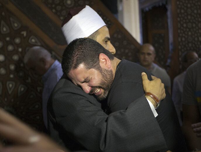 El imán Samir Abdel Bary consuela al director de cine Osman Abu Laban, quien perdió cuatro parientes en la desaparición del vuelo París - El Cairo de EgyptAir. (AP)