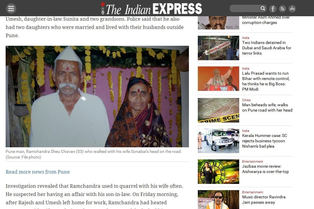 El suceso ocurrió cuando este hombre, Ram Chandra Chavan, de 60 años, salió a la calle con la cabeza de su esposa después de supuestamente decapitarla por serle infiel, dijo el inspector de la comisaría de Bharti Vidhyapeeth en Pune, M. B. Chavhan.