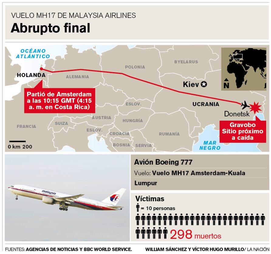 El avión de Malasia Airlines que salió de Amsterdam con rumbo a Kuala Lumpur se estrelló el jueves en el este de Ucrania, en una zona controlada por los separatistas prorrusos, causando 295 muertos.