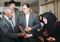 El secretario general de la ONU, Kofi Annan, recibió ayer una flor al llegar a un hotel en la capital iraní. | AFP (BEHROUZ MEHRI)