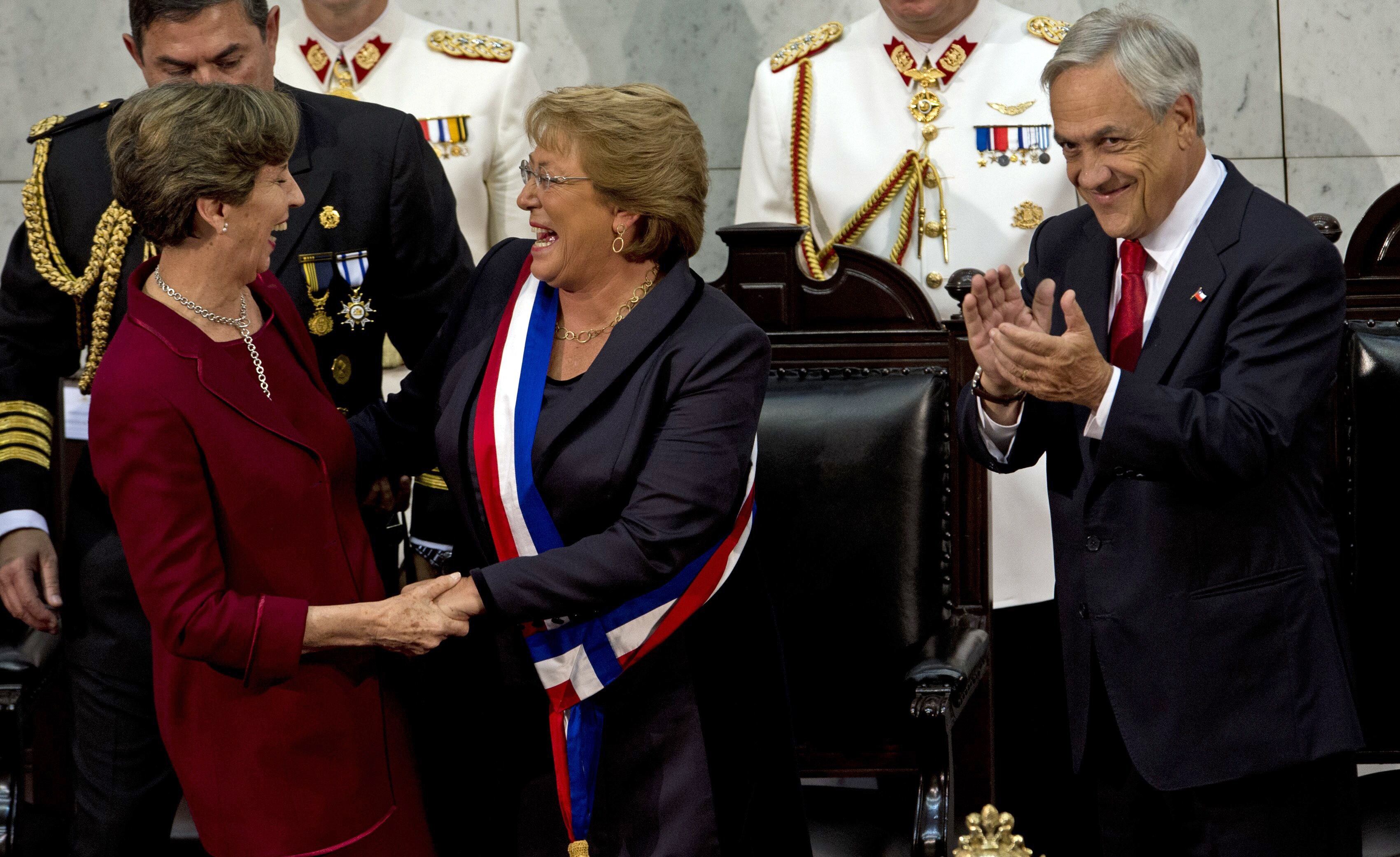 La nueva mandataria chilena, de 62 años, recibió la banda presidencial de manos de la nueva presidenta del Senado, Isabel Allende, hija del fallecido presidente Salvador Allende y la primera mujer en la historia de Chile en presidir la Cámara alta.