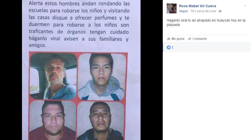 "¡Alerta! ¡Tráfico de órganos! ¡Cuiden a sus hijos!". Una noticia falsa en Facebook demostró su poderoso alcance: habitantes de un sector pobre de la periferia de Lima salieron enardecidos en busca de los delincuentes, destruyendo todo a su paso.