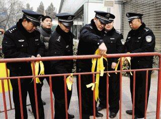 Policías removían hoy cintas amarillas en protesta por el juicio del disidente chino Liu Xiaobo en Pekín. | AP (Andy Wong)